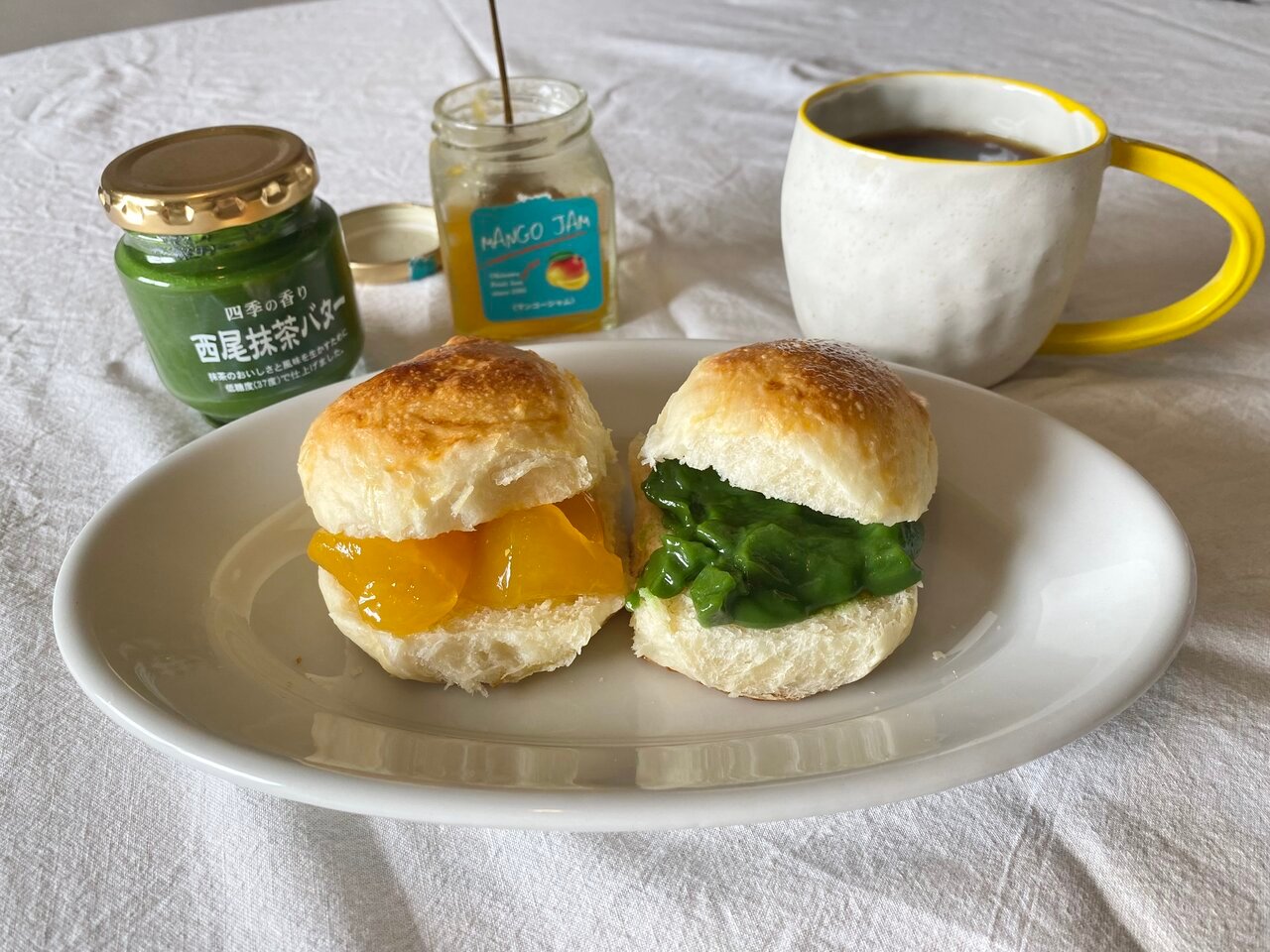 ちぎりパンにはマンゴージャムと、抹茶バターペーストをたっぷりサンドしてみました🫶🏻