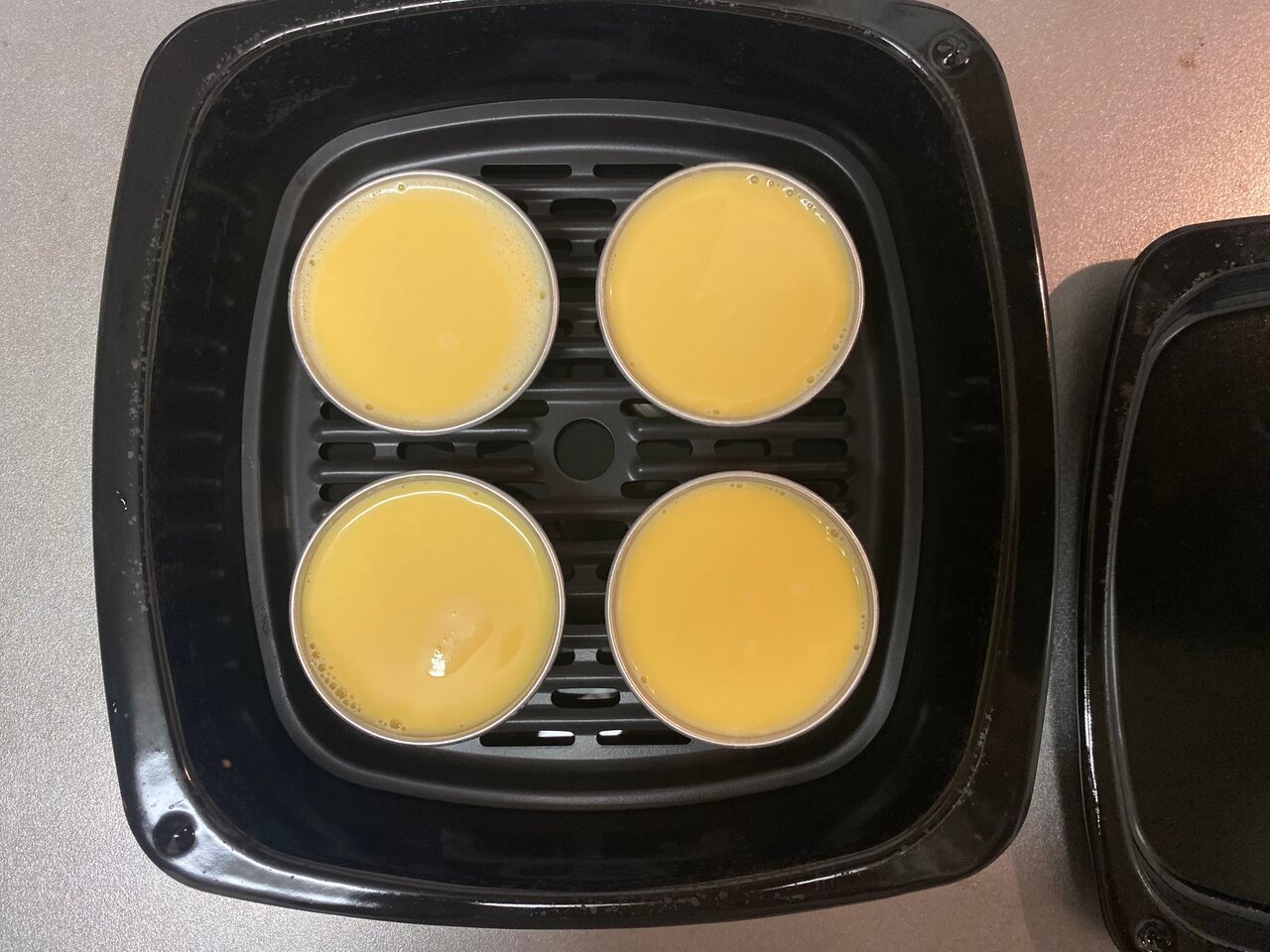 プリンカップにカラメルソースと、濾した卵液を入れます。