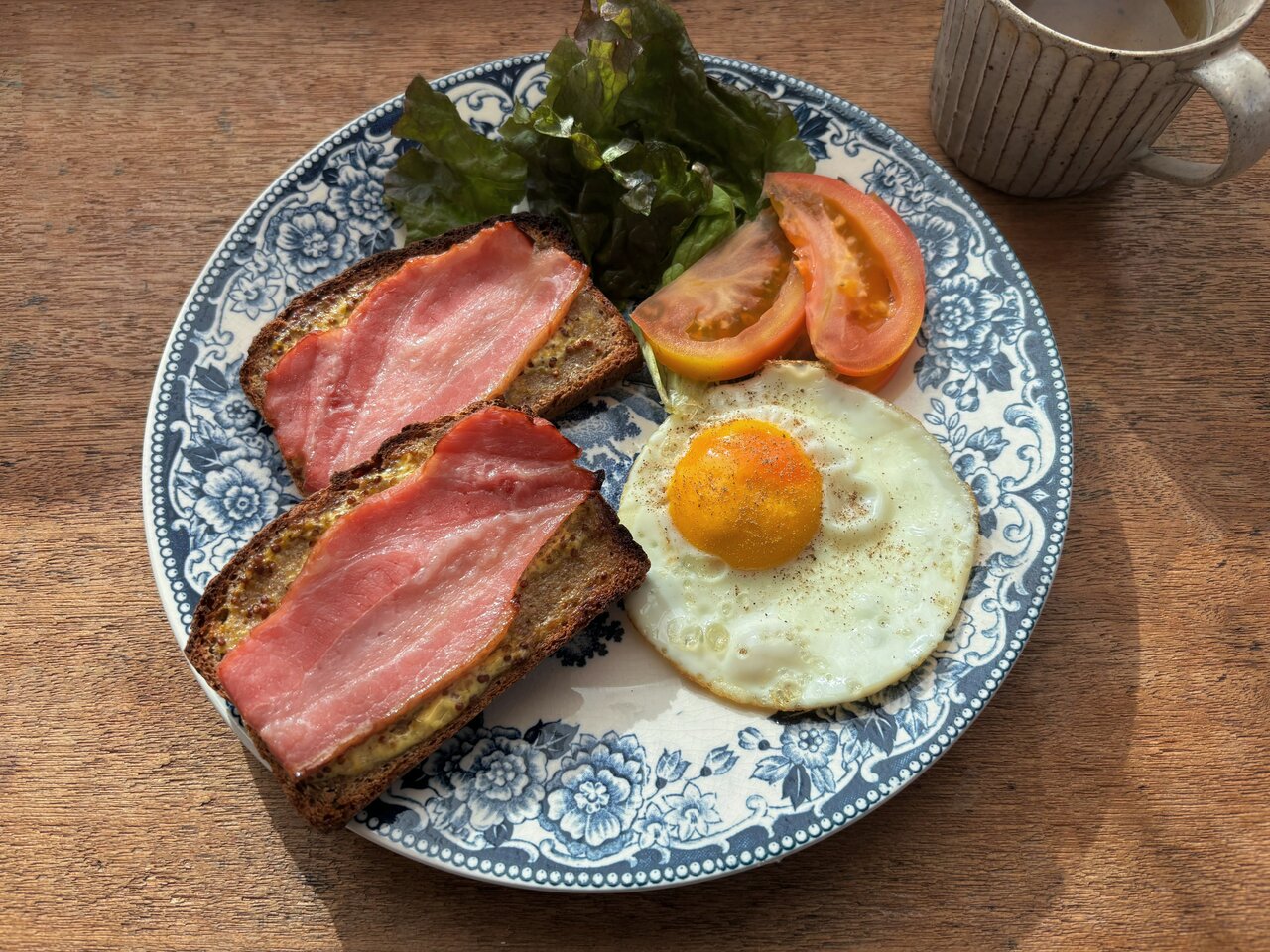 食パンはマヨネーズと粒マスタードを塗ってからベーコンをのせるのがおすすめです🥓