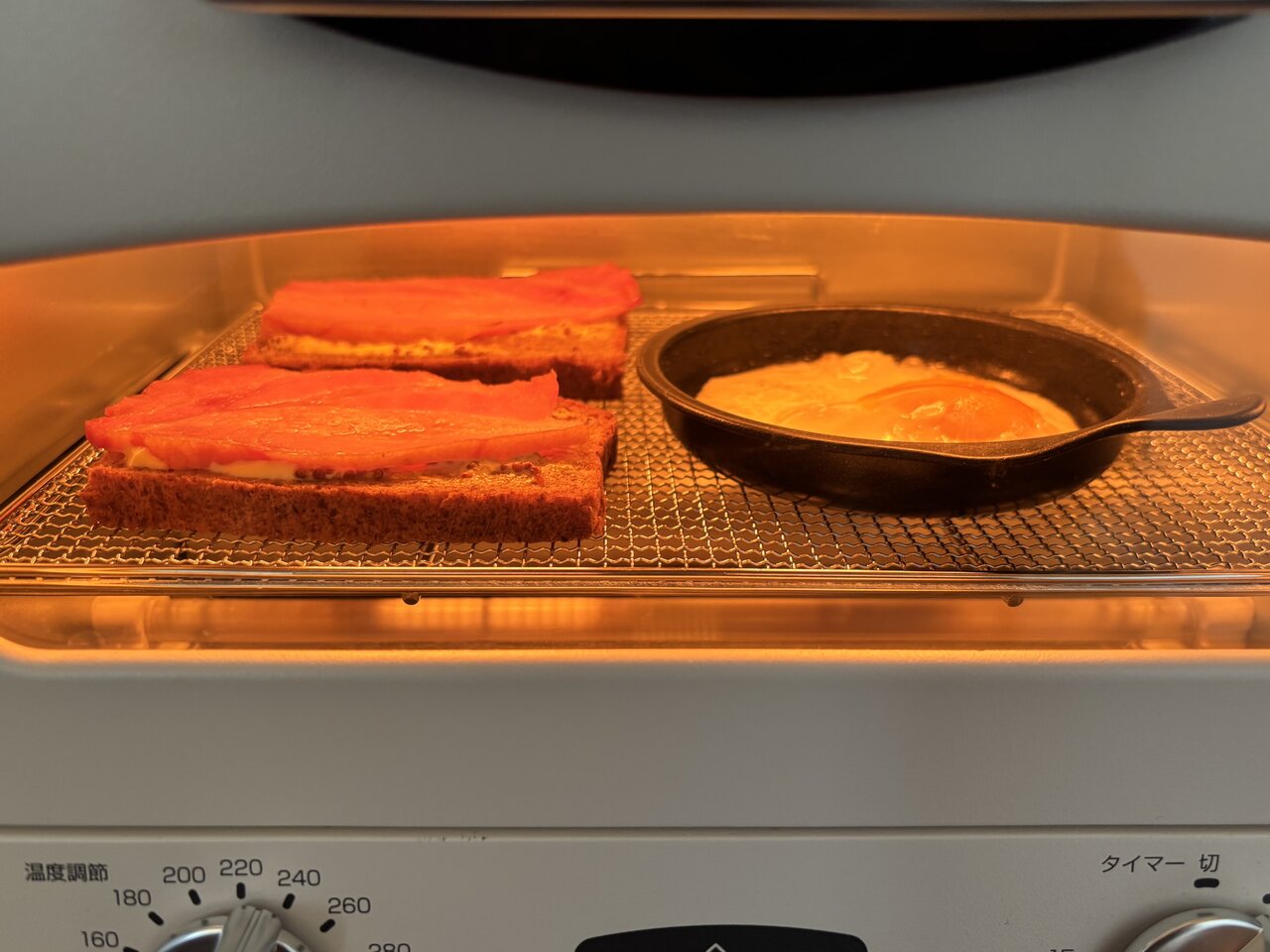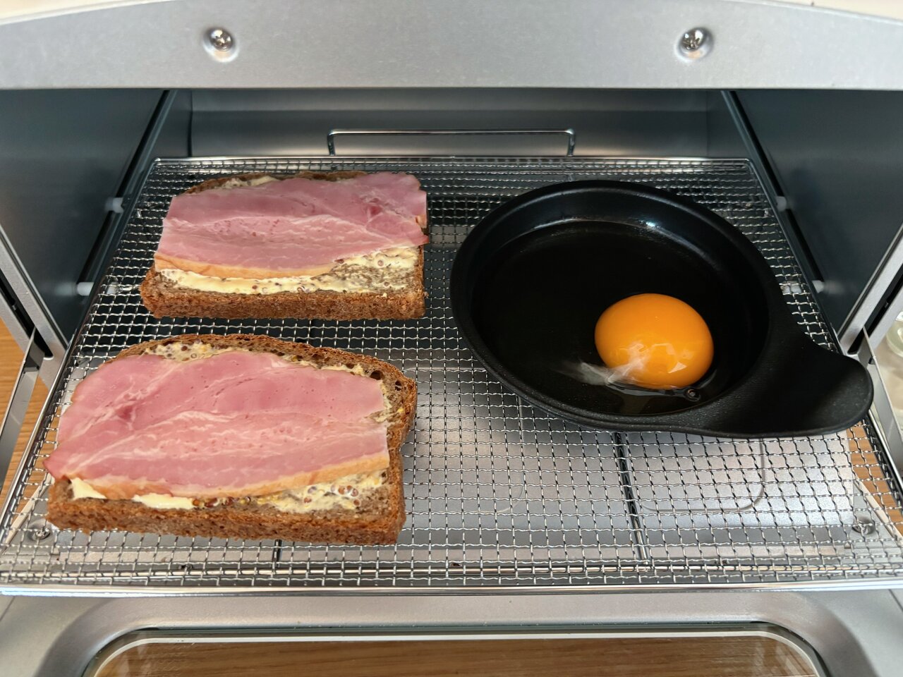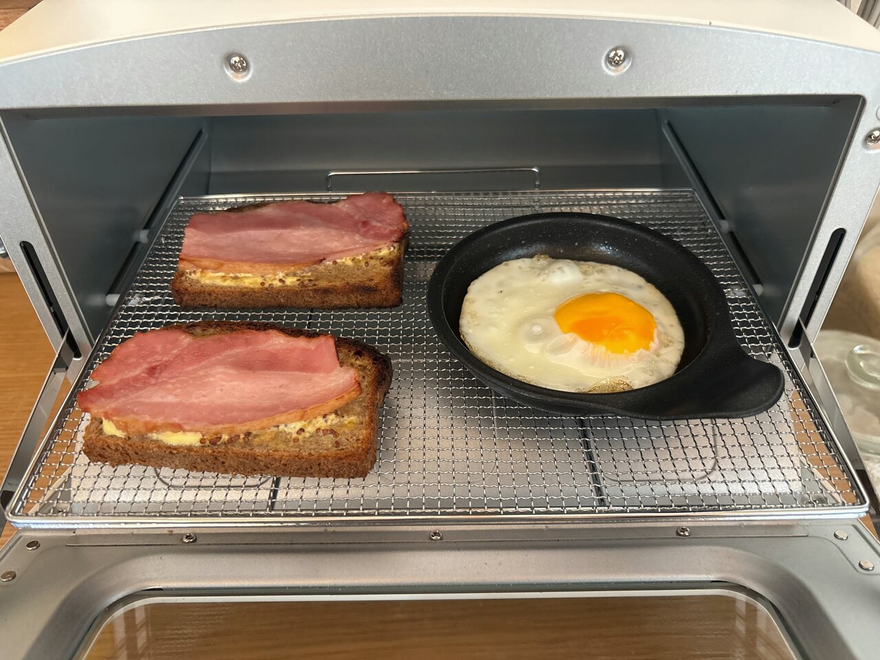 洗い物を増やさないことも時短では欠かせないですよね。朝はフライパンを使わずに、パンと一緒にトースターで目玉焼きも焼いちゃいます!