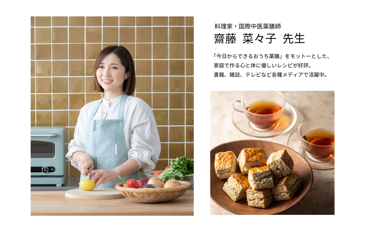 今回は『グラファイトオーブンレンジ』のレシピブックを監修してくださった、料理家・国際中医薬膳師の齋藤菜々子さんをお招きし、齋藤さん監修のもと、アラジンの新商品『グラファイトオーブンレンジ』を使ってスコーン作りを体験していただきます。