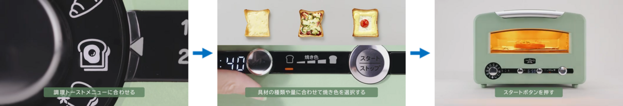 「調理トーストメニュー」とは、具材(チーズ、卵、野菜など)を載せたパンの「表面はこんがり、裏面は焦がさず、具材までしっかり加熱」できる専用メニューです。
