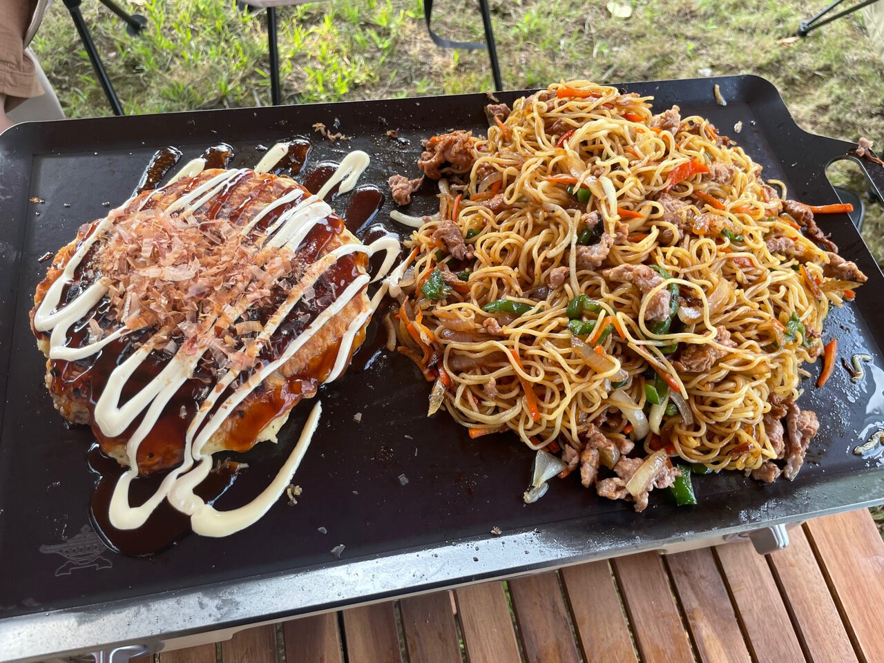 先に全面で焼きそばを作り片側によせて弱火にして保温しながら片側でお好み焼きを作りました。