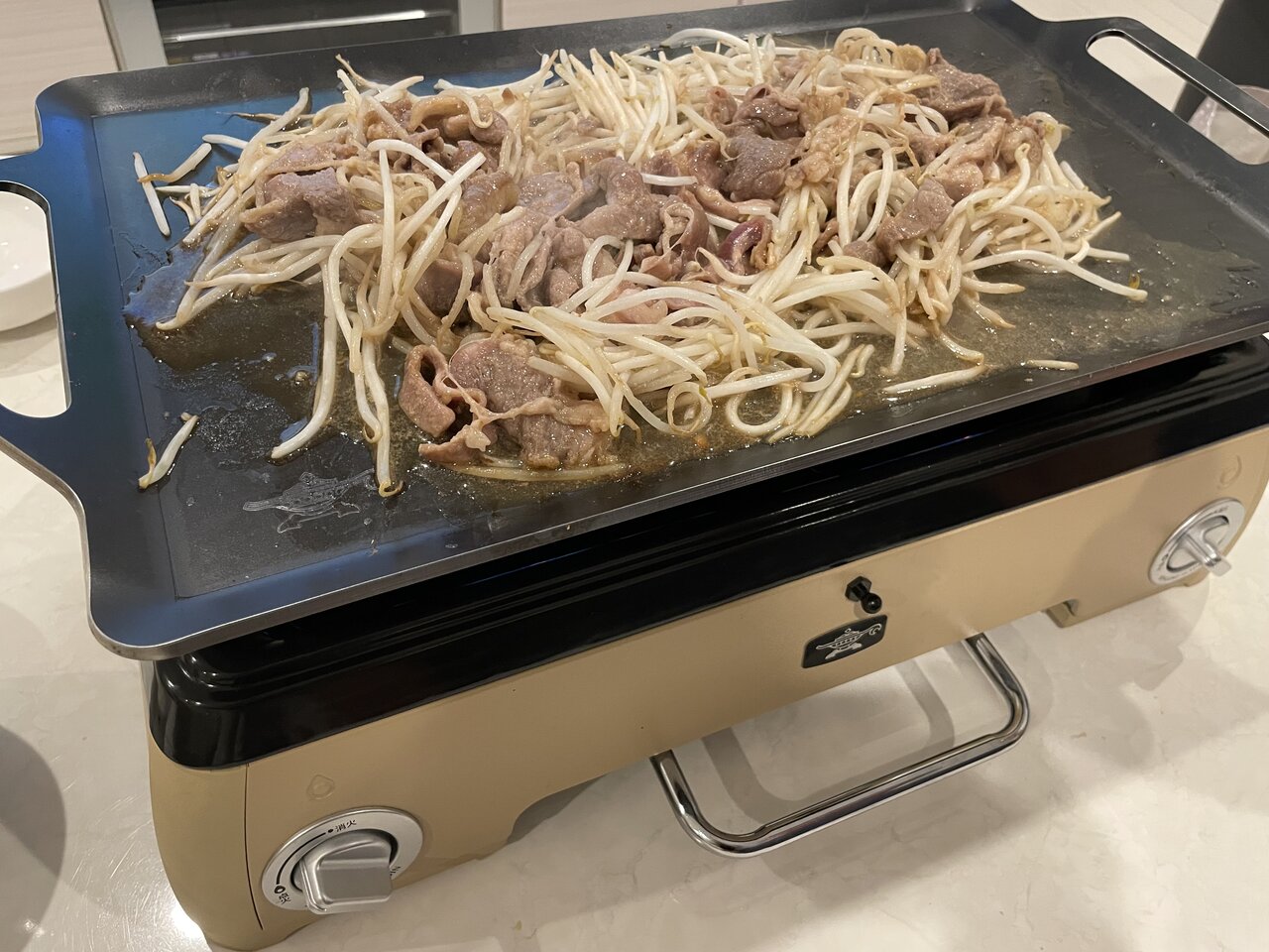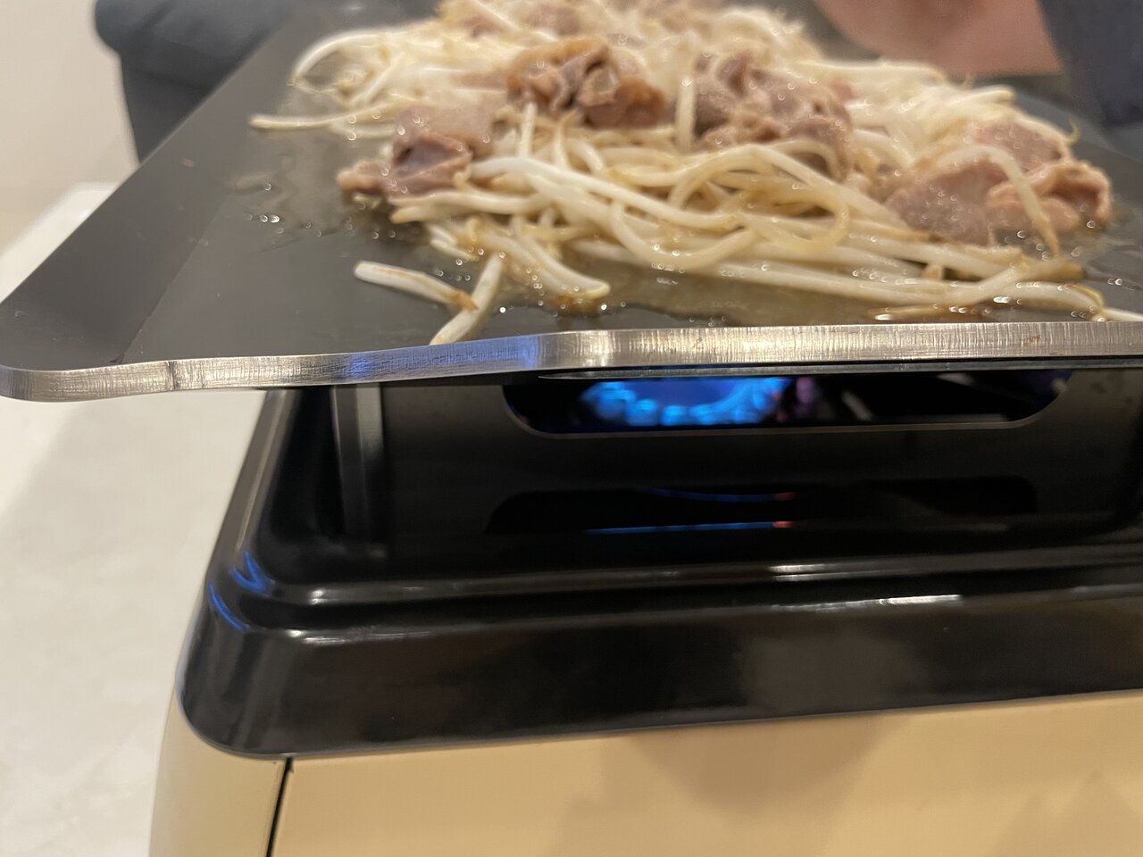 2.プレートを温めたらオリーブオイルか食用油を薄くひき、煙がで始めたら十分加熱されたので弱火か一度火をとめる