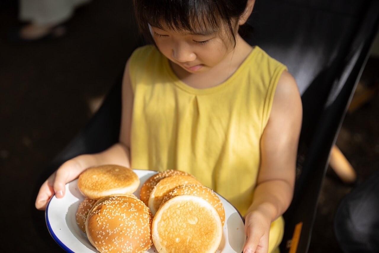 パティを焼いて、バンズに野菜も焼いて並べて〜