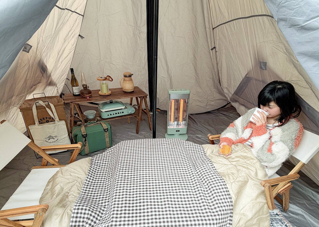 さらに首振り機能と反射板のおかげで、暖かさが一方向だけに偏らず、テントの中にじんわり広がります。高さのあるワンポールテントもしっかり暖まる感覚でした。