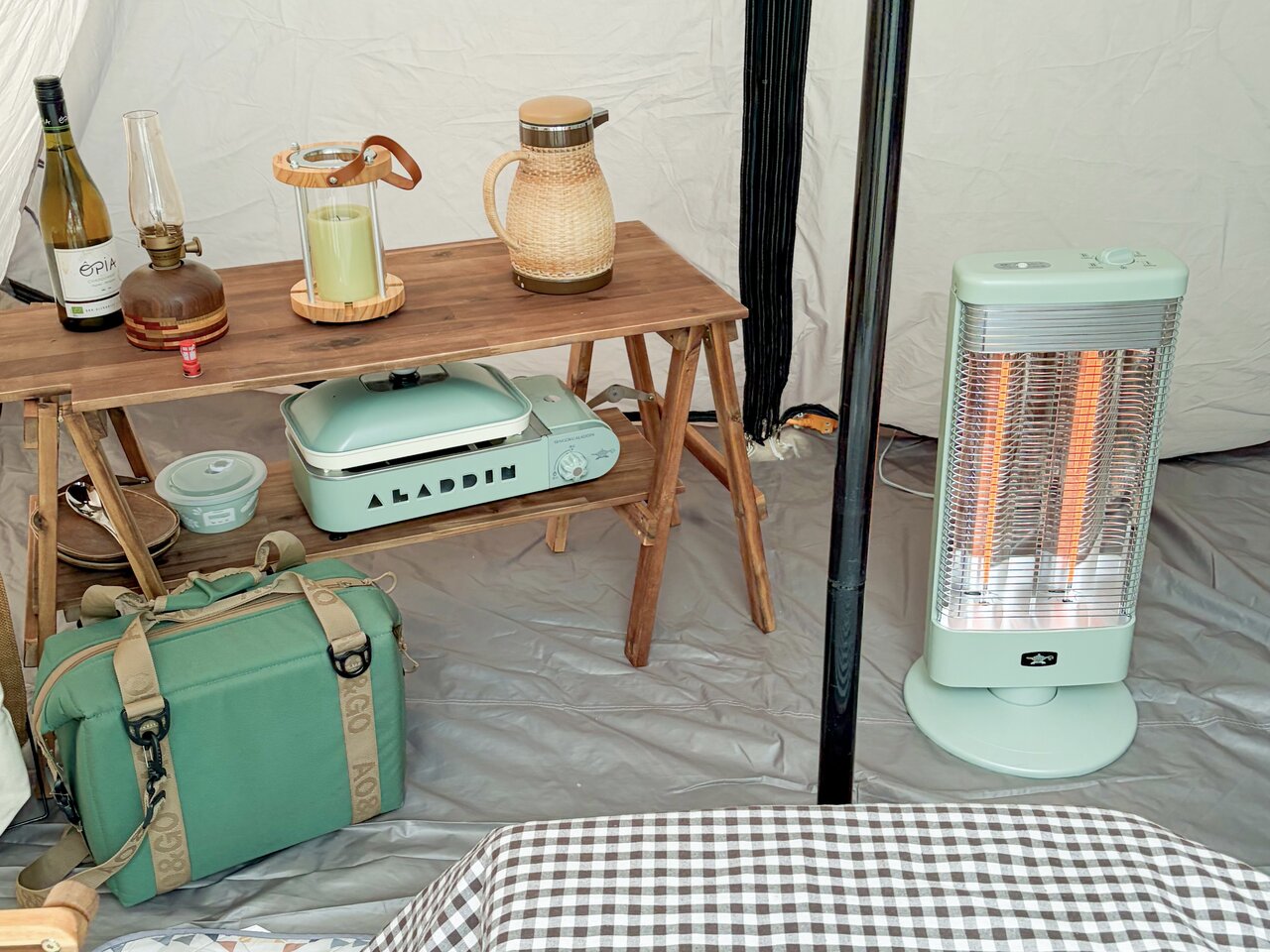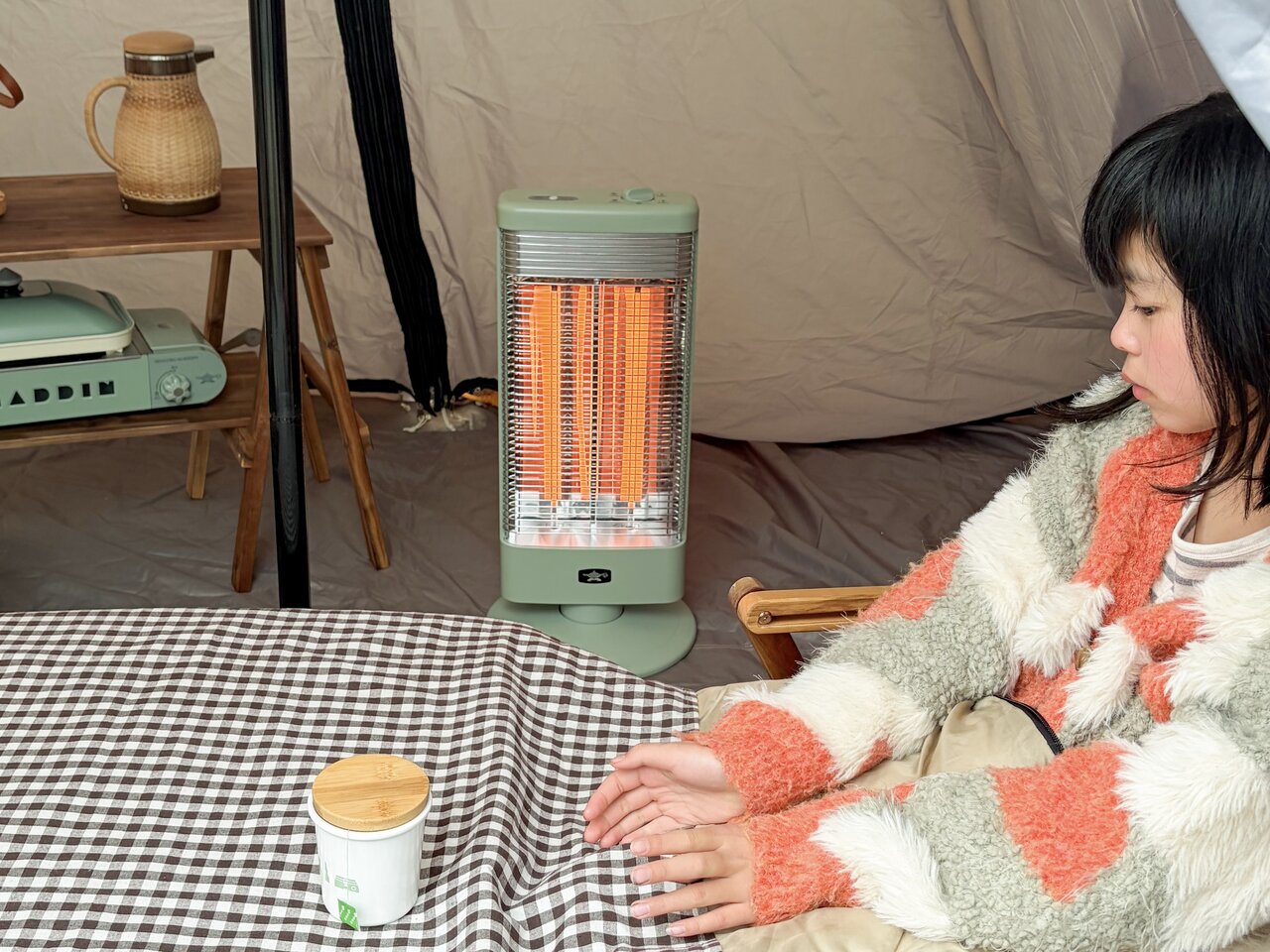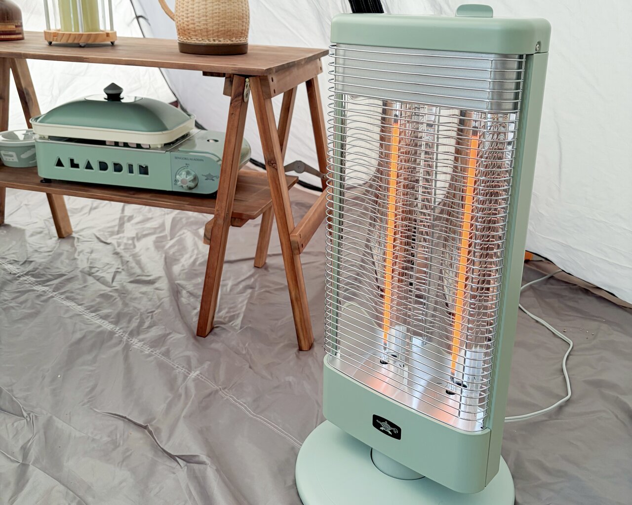遠赤グラファイトヒーター (AEH-G1000A) をテントの中へ。